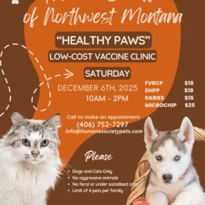 The Humane Society of Northwest Montana has developed community programs which include the Charlotte Edkins Adoption Program, “Hand to Paws” Foster Hero Program, Low-cost Vaccine Clinics and “Nourishing Paws” Pet Pantry. In addition to hosting various senior and children’s organizations such as The Springs Assisted Living, My Glacier Village and CASA for kids.