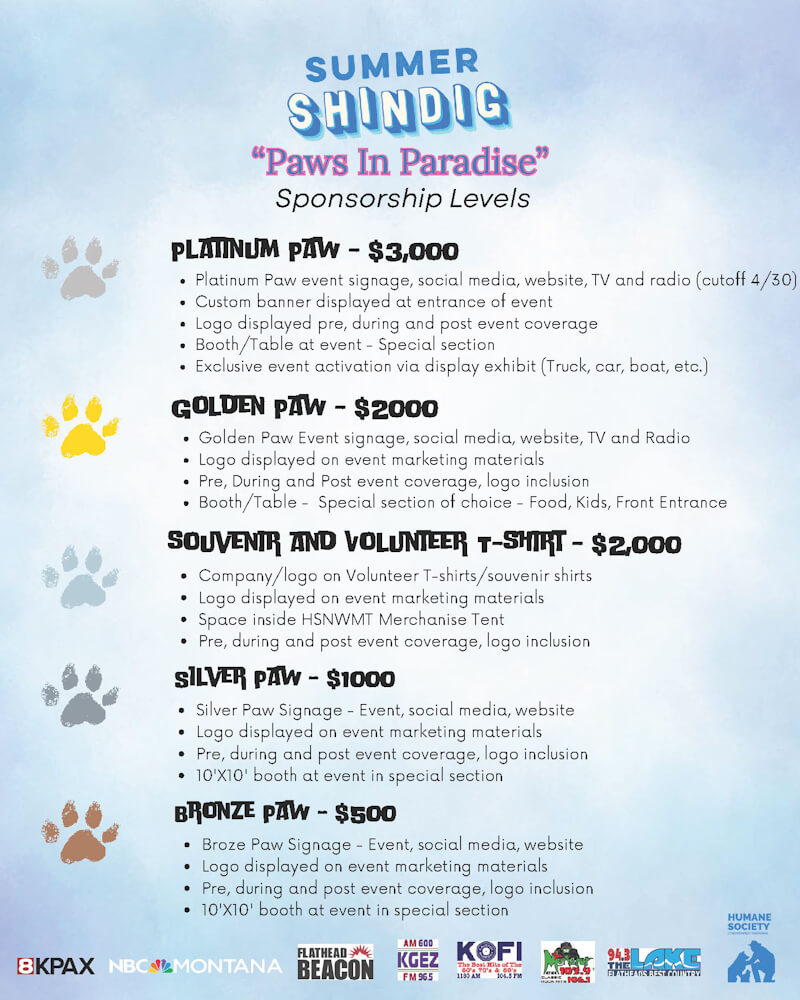 The Humane Society of Northwest Montana’s Annual Summer Shindig & Fundraiser is more than just a celebration—it’s a critical event that fuels our mission to save the lives of dogs and cats throughout the Flathead Valley.